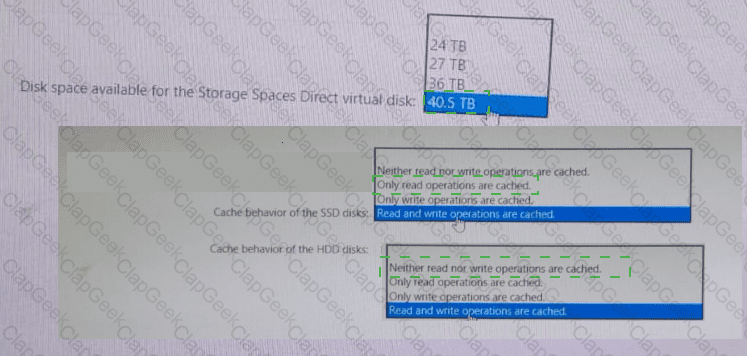 What is the total amount of disk space available for the Storage Spaces Direct virtual disk, and which operations are cached for the SSD and HDD disks? To answer, select the appropriate options in the answer area.