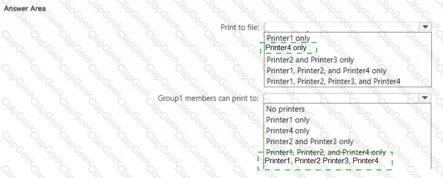 Which migrated printers can print to file, and to which migrated printers can the members of Group1 print? To answer, select the appropriate options in the answer area.