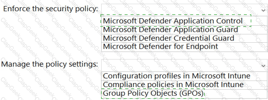 Which service should you use to enforce the security policy, and what should you use to manage the policy settings? To answer, select the appropriate options in the answer area.