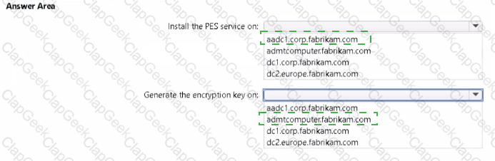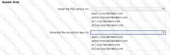 You are planning the europe.fabrikam.com migration to support the on-premises migration plan-Where should you install the Password Export Server (PES) service, where should you generate the encryption key? To answer, select the appropriate options in the answer area.