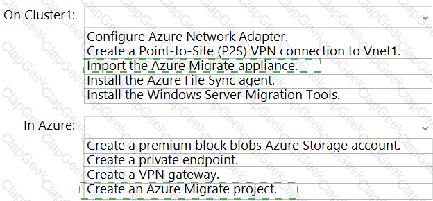 What should you do on Cluster1 and in Azure before you perform the migration? To answer, select the appropriate options in the answer area.