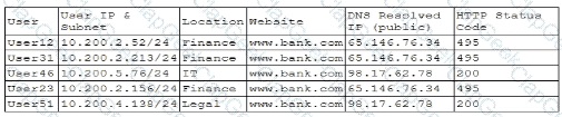 A company's help desk is experiencing a large number of calls from the finance department slating access issues to www bank com The security operations center reviewed the following security logs: