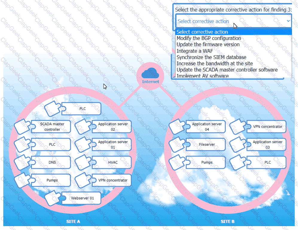 For findings 1 and 2, select the items that should be replicated to Site B. For finding 3, select the item requiring configuration changes, then select the appropriate corrective action from the drop-down menu.