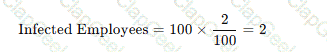 At a facility with 10.000 employees. 5,000 are at risk for bloodbome pathogen exposure. Over the past five years, 100 of the 250 needlestick injuries involved exposure to bloodborne pathogens, and 2% of exposed employees seroconverted. How many employees became infected?
