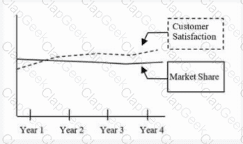 A marketing group used data from internally developed customer satisfaction surveys and externally acquired market share data covering the same period to develop the following graph. The CEO asks the quality manager to review this information and explain it at the next senior management meeting.