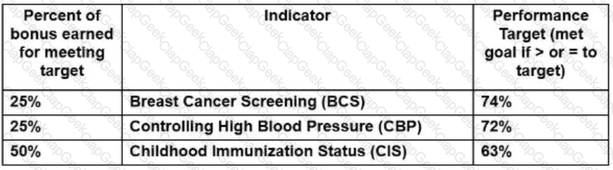 Providers in a clinic have the opportunity to earn an incentive based on performance measure results. Based on the table below showing how the incentive is structured and current performance, the providers should focus on which of the following to maximize their incentive?