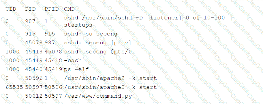 The company's IDS has reported an anomaly. The cloud engineer remotely accesses the cloud instance, runs a command, and receives the following information: