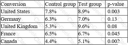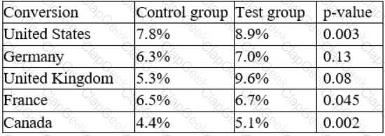 An e-commerce company recently tested a new website layout. The website was tested by a test group of customers, and an old website was presented to a control group. The table below shows the percentage of users in each group who made purchases on the websites: