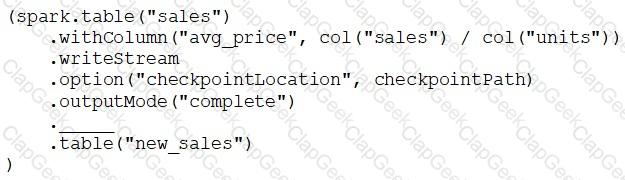 If the data engineer only wants the query to process all of the available data in as many batches as required, which of the following lines of code should the data engineer use to fill in the blank?