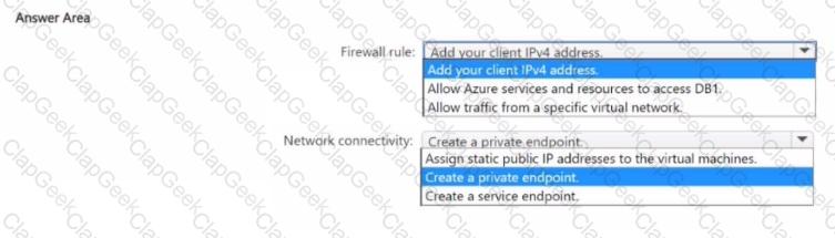 How should you configure the firewall rule, and how should you establish network connectivity from the virtual machines to DB1? To answer, select the appropriate options in the answer area.