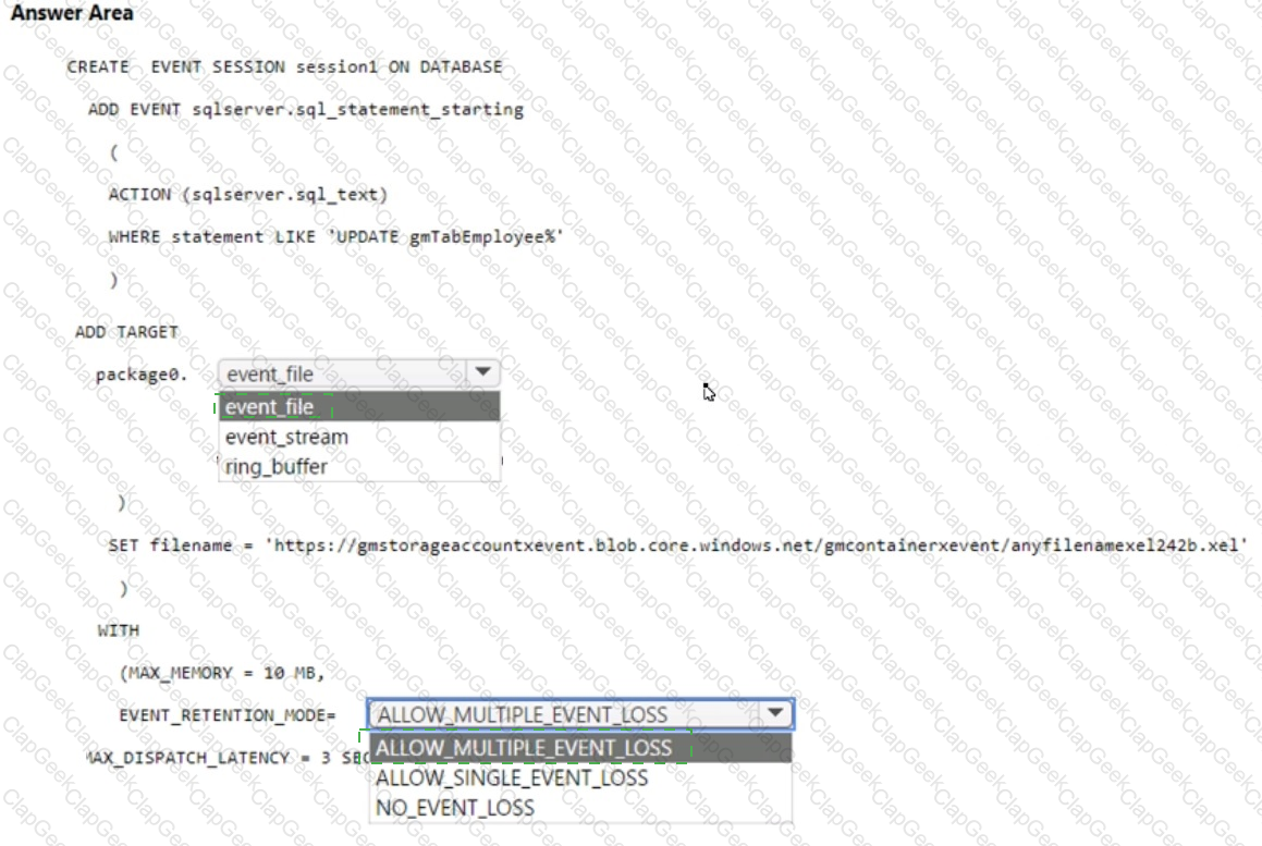 You have an Azure subscription that contains an instance of SQL Server on Azure Virtual Machines. The virtual machine hosts a database named DB1. You need to monitor DB1 by using Extended Events. The solution must meet the following requirements: