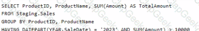 You need to write a T-SQL query that will return data for the year 2023 that displays ProductID and ProductName arxl has a summarized Amount that is higher than 10,000. Which query should you use?