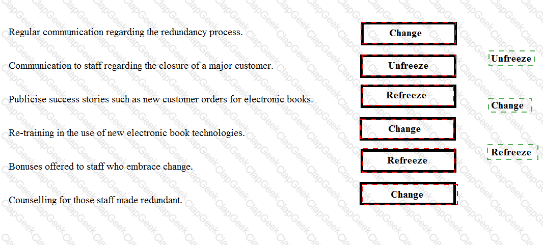 Which of the activities below would occur within the 'Unfreeze', 'Change' or 'Refreeze' stage of Lewin's three-stage model?