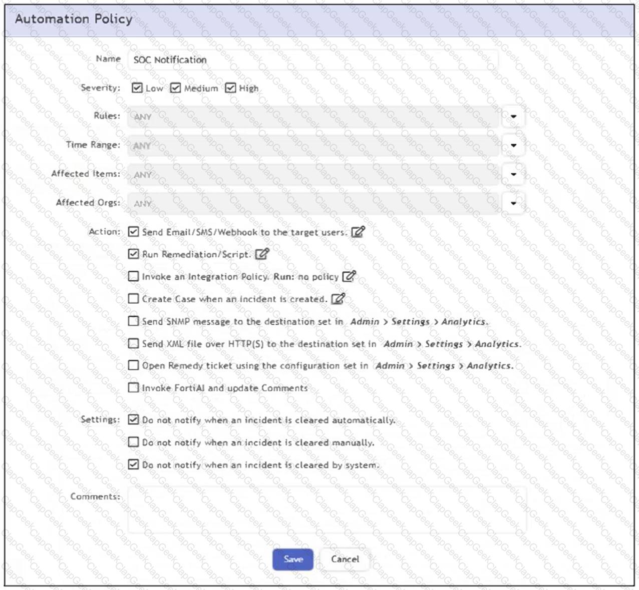 What happens when an analyst clears an incident generated by a rule containing the automation policy shown in the exhibit?