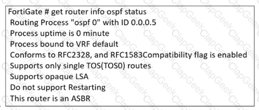 The partial output of an OSPF command is shown. You are checking the OSPF status of a FortiGate device when you receive the output shown in the exhibit. Based on the output, which two statements about FortiGate are correct? (Choose two answers)
