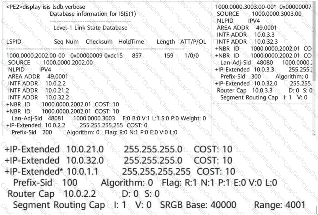 Which MPLS label will be used by PE2 for forwarding traffic to 10.0.1.1 based on the following SR-MPLS database?