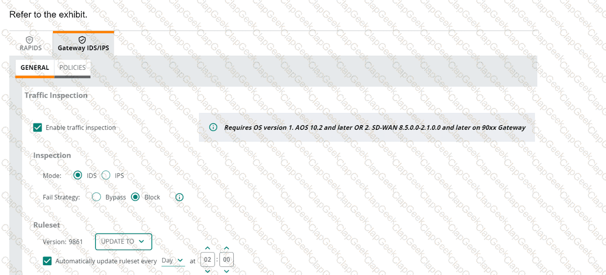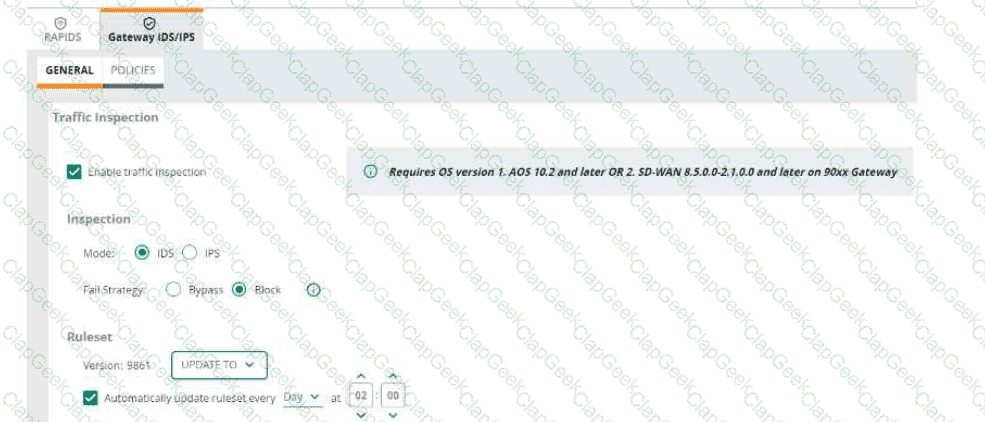 An HPE Aruba Networking 9x00 gateway is part of an HPE Aruba Networking Central group that has the settings shown in the exhibit. What would cause the gateway to drop traffic as part of its IDPS settings?