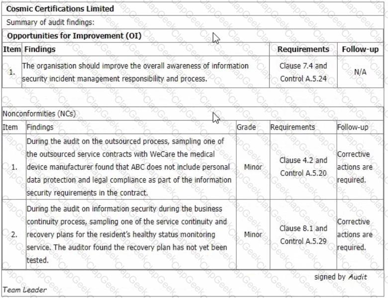 You are performing an ISMS audit at a residential nursing home railed ABC that provides healthcare services. The next step in your audit plan is to verify the effectiveness of the continual improvement process. During the audit, you learned most of the residents' family members (90%) receive WeCare medical device promotional advertisements through email and SMS once a week via ABC's healthcare mobile app. All of them do not agree on the use of the collected personal data (or marketing or any other purposes than nursing and medical care on the signed service agreement with ABC. They have very strong reason to believe that ABC is leaking residents' and family members' personal information to a non-relevant third party and they have filed complaints.