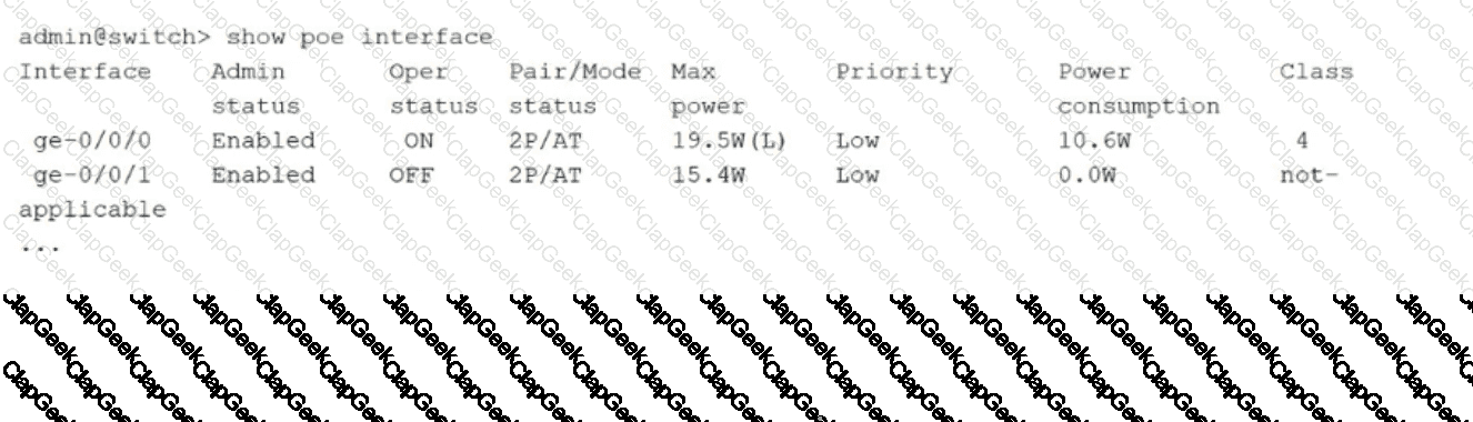 You are deploying a new campus switching environment using various EX Series switch models. The devices attached to one of the new EX Senes switches include IP phones, loT devices, and wireless access points (APs) requiring power over Ethernet (PoE) with varying power requirements. A sample output from one of these switches is shown in the exhibit.