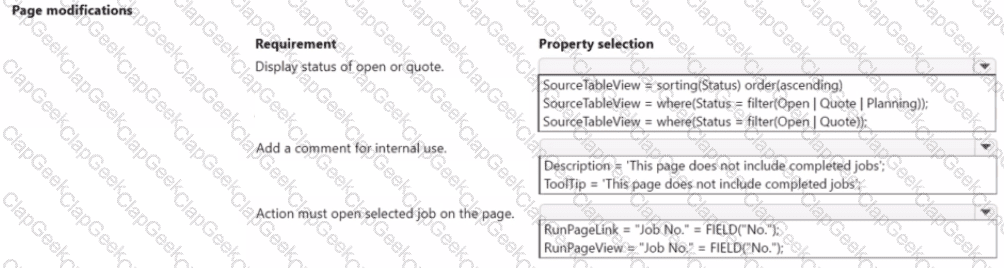 A company has a page named New Job Status connected to a source table named Job. The page has an action named Item Ledger Entries. The company requires the following changes to the page: