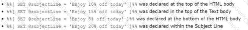 Certification Aid wants to include SSJS in an email message. Which code block can be used for this? Choose 2.