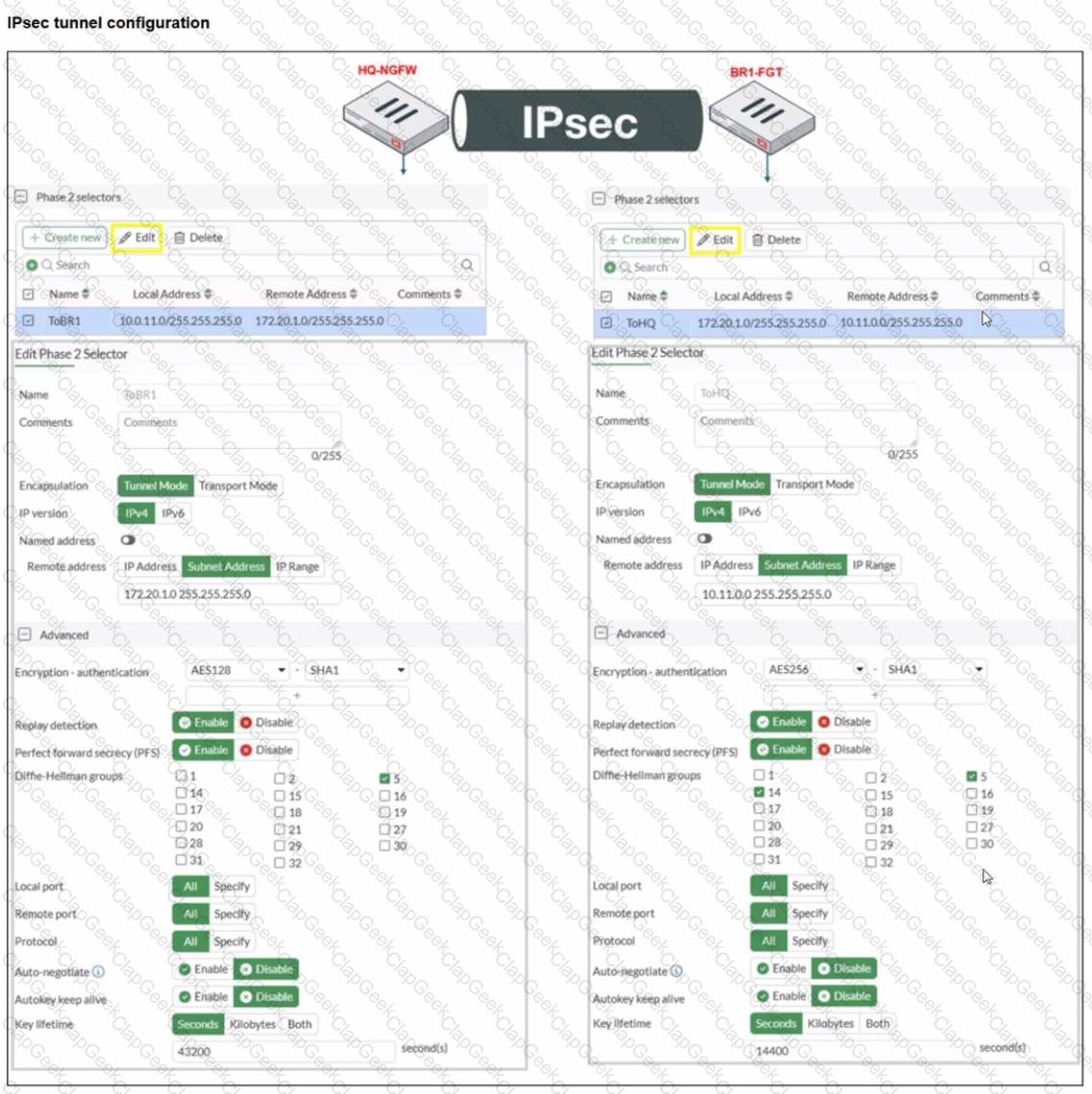 Based on the phase 2 configuration shown in the exhibit, which two configuration changes will bring phase 2 up? (Choose two.)