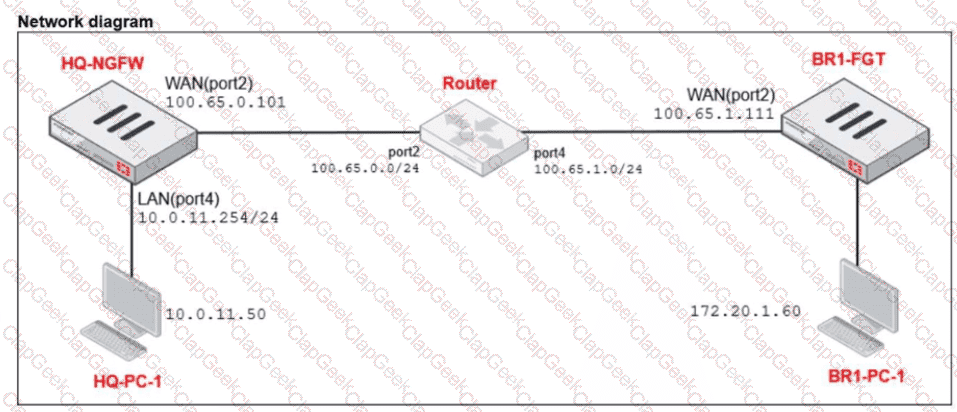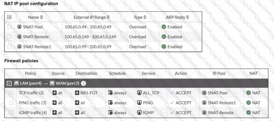 Which IP address will be used to source NAT (SNAT) the traffic, if the user on HQ-PC-1 (10.0.11.50) pings the IP address of BR-FGT (100.65.1.111)?