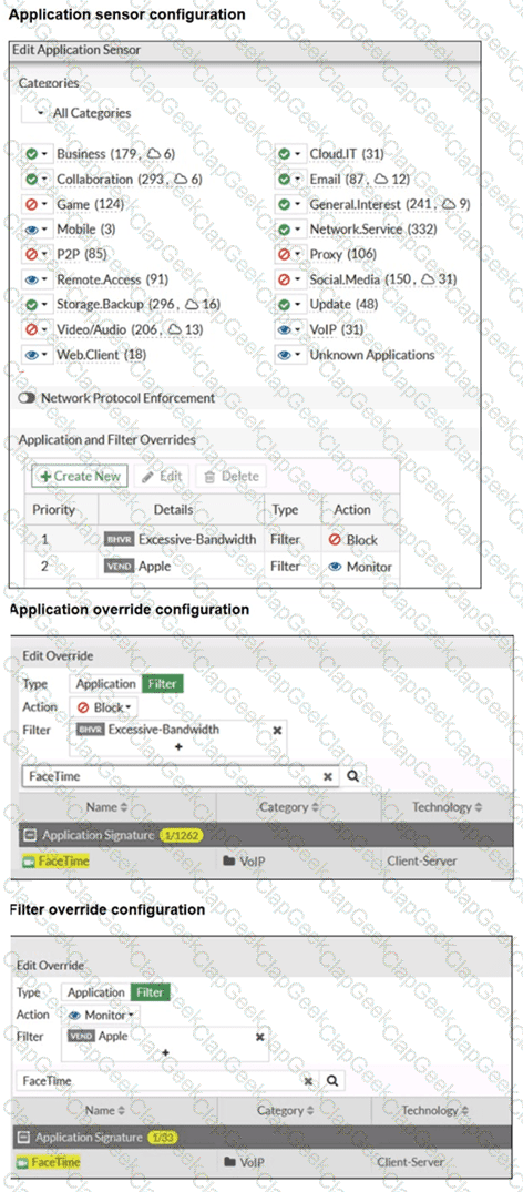 The exhibits show the application sensor configuration and the Excessive-Bandwidth and Apple filter details. Based on the configuration, what will happen to Apple FaceTime if there are only a few calls originating or incoming? (Choose one answer)
