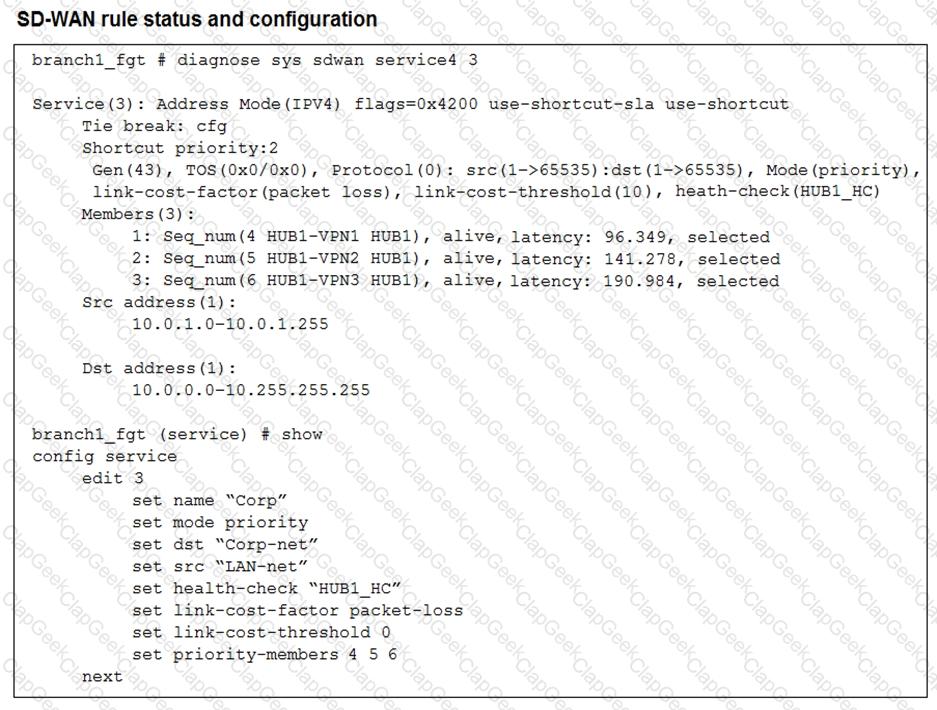 (Refer to the exhibits. You collected the output shown in the exhibits and want to know which interface TCP traffic will flow through from the user device 10.0.1.101 to the corporate file server 10.0.0.125 . All SD-WAN links are stable.