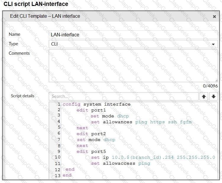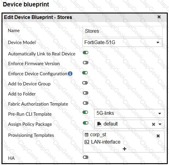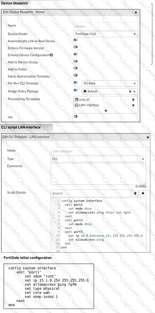The administrator configured a device blueprint and CLI scripts as shown in the exhibits, to prepare for onboarding FortiGate devices in the company’s stores. Later, a technician prepares a FortiGate 51G with a basic configuration and connects it to the network. The basic configuration contains the port1 configuration and the minimal configuration required to allow the device to connect to FortiManager.