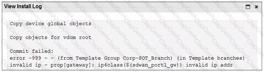 When you install the device settings, FortiManager prompts you with the error “Copy Failed” for the device branch1_fgt. When you click the log button, FortiManager displays the message shown in the exhibit.