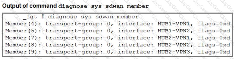 The first exhibit shows the SD-WAN zone HUB1 and SD-WAN member configuration from an SD-WAN template, and the second exhibit shows the output of command diagnose sys sdwan member collected on a FortiGate device.