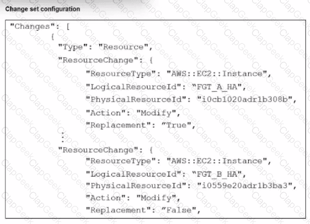 You are managing an active-passive FortiGate HA cluster in AWS that was deployed using CloudFormation. You have created a change set to examine the effects of some proposed changes to the current infrastructure. The exhibit shows some sections of the change set.