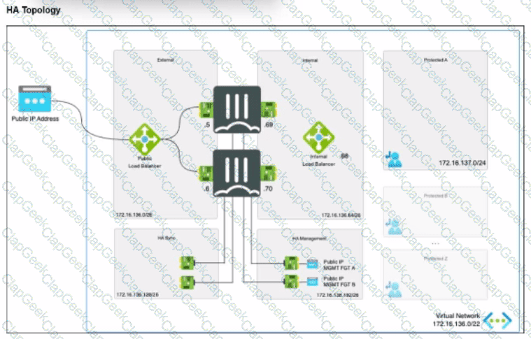 The exhibit shows an active-passive high availability FortiGate pair with external and internal Azure load balancers There is no SDN connector used in this solution.