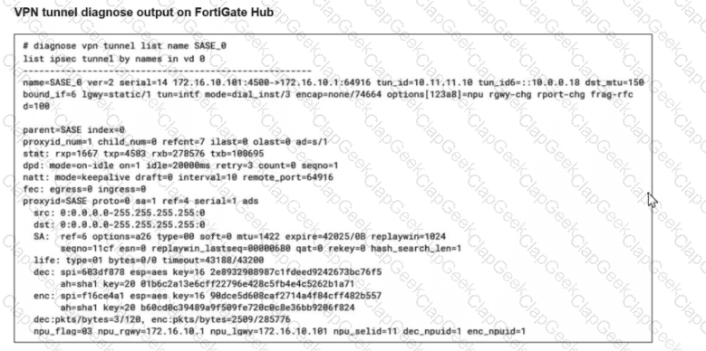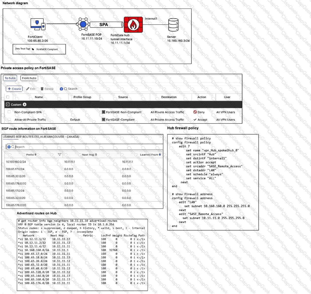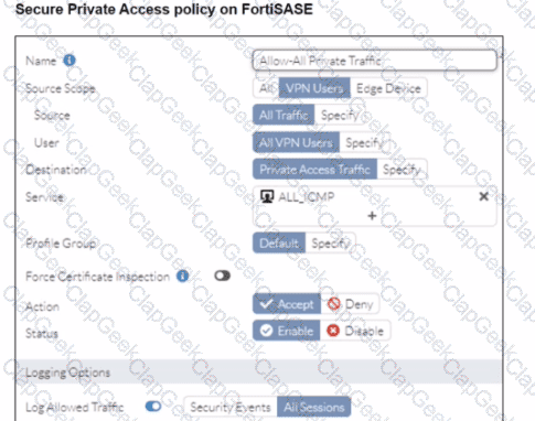 A FortiSASE administrator is trying to configure FortiSASE as a spoke to a FortiGate hub. The tunnel is up to the FortiGale hub. However, the administrator is not able to ping the webserver hosted behind the FortiGate hub.