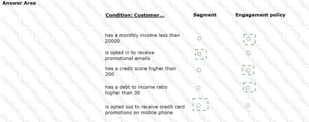 For each condition below, select which two conditions should be defined in Segment and which three conditions should be defined in Engagement policy as best practice.
