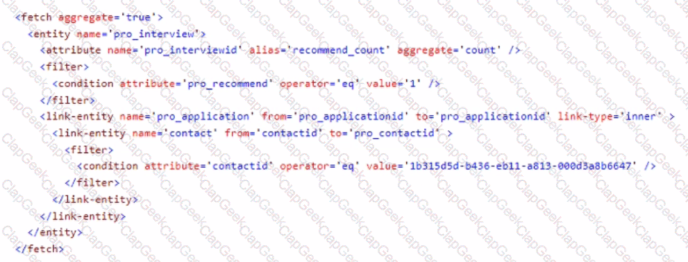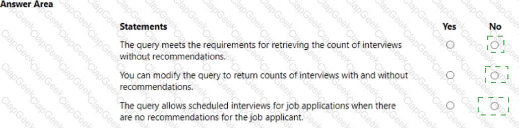 You create the following Fetch XML query to determine the number of interviews where there are no recommendations for an applicant.