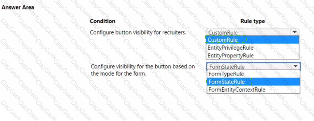 You need to implement ribbon display rules to control availability for the scoring command button. Which rule types should you use? To answer, select the appropriate options in the answer area. NOTE: Each correct selection is worth one point.