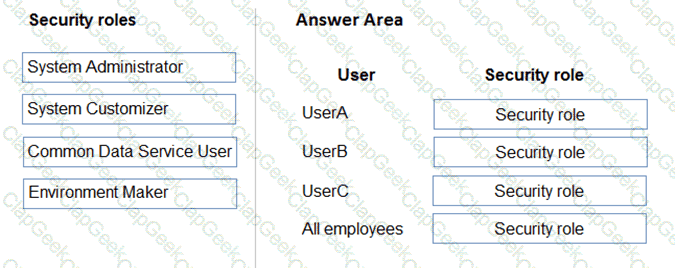 Which security roles should you use? To answer, drag the appropriate security roles to the correct users. Each security role may be used once, more than once, or not at all. You may need to drag the split bar between panes or scroll to view content.