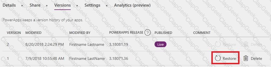 You have a Power Apps app. You create a new version of the app and then publish the new version. A customer goes through the process of restoring the previous version of the app. In the Version tab for the app, you will see two versions of the app.
