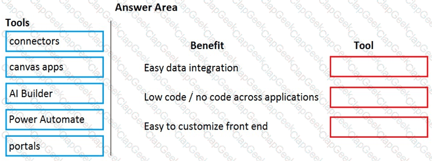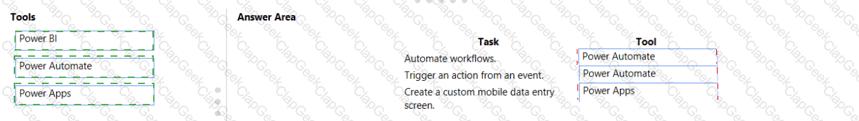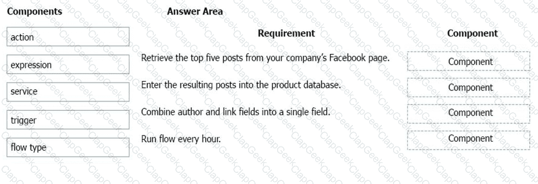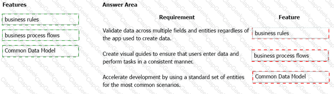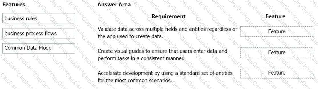 Which Power Platform features should you recommend? To answer, drag the appropriate features to the correct requirements. Each feature may be used once, more than once, or not at all. You may need to drag the split bar between panes or scroll to view content.