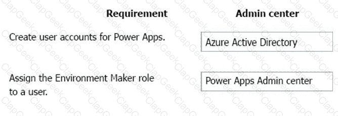 Which admin centers should you use? To answer, drag the appropriate admin centers to the correct requirements. Each admin center may be used once, more than once, or not at all. You may need to drag the split bar between panes or scroll to view content.