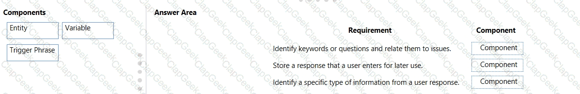 To answer, drag the appropriate components to the correct requirements. Each component may be used once, more than once, or not at all. You may need to drag the split bar between panes or scroll to view content.