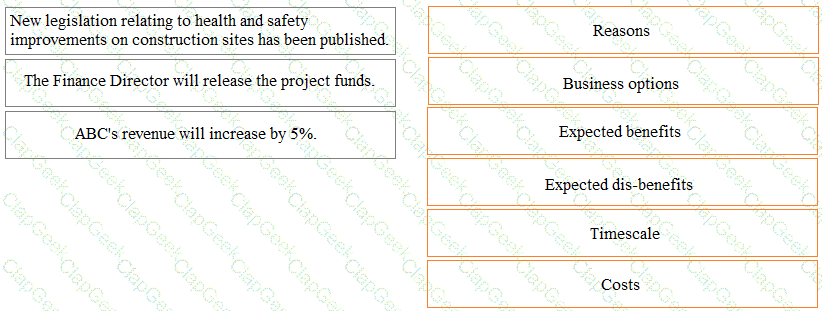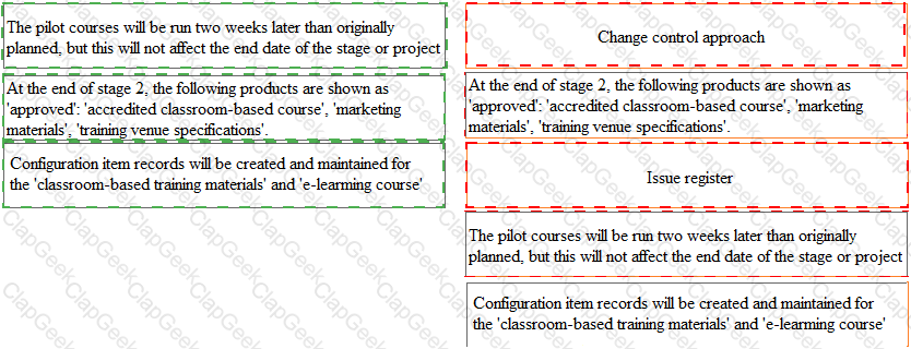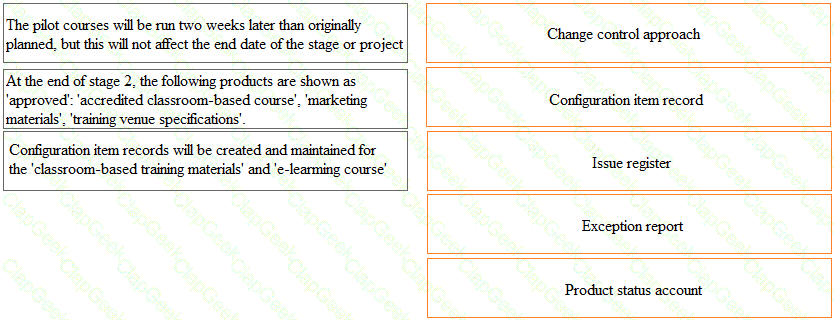 Column 1 contains a number of issues for this project. Select from Column 2 the appropriate category for each issue. Each selection from Column 2 can be used once, more than once or not at all.