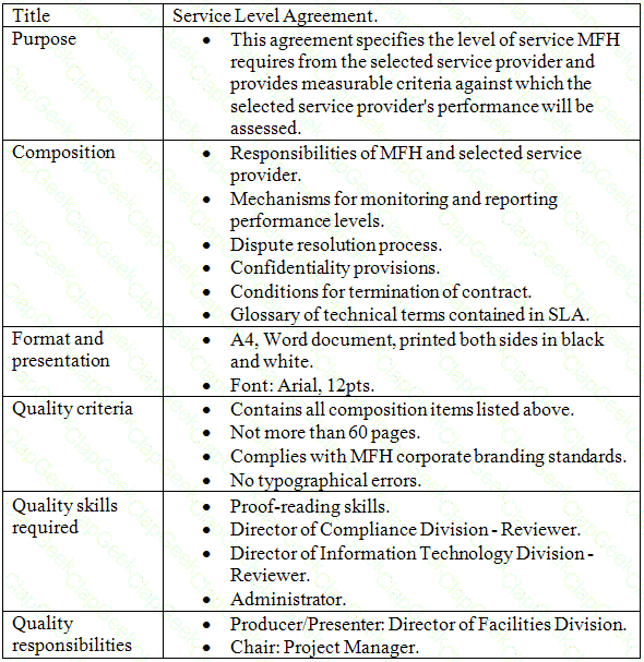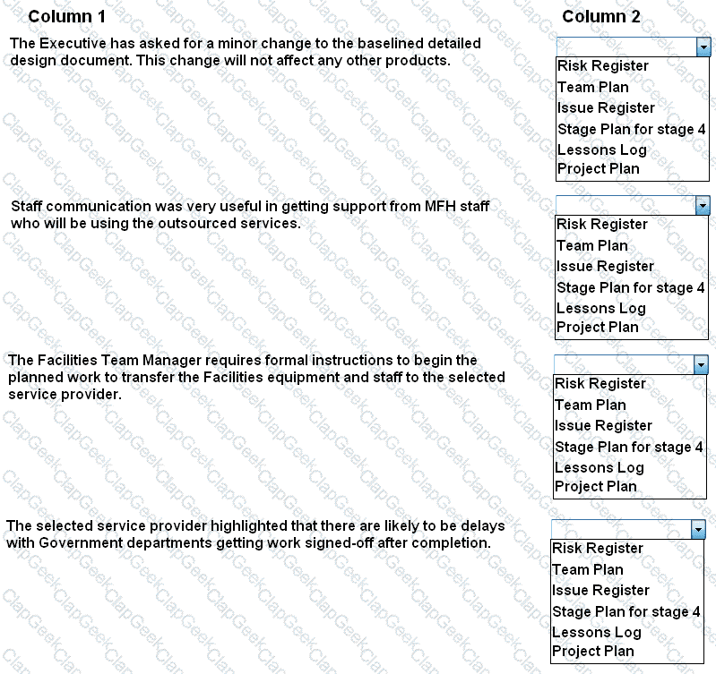 The Outsourcing project has completed the Starting up a Project process and is now in the initiation stage. Because of the strategic importance of the project, the MFH Chief Executive Officer has taken the role of Executive. A PRINCE2-experienced Project Manager has been appointed from within MFH. Staff within the business functions being outsourced will work with the external consultants who conducted the feasibility study to define the detailed designs.