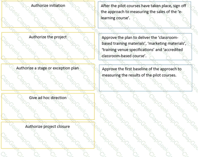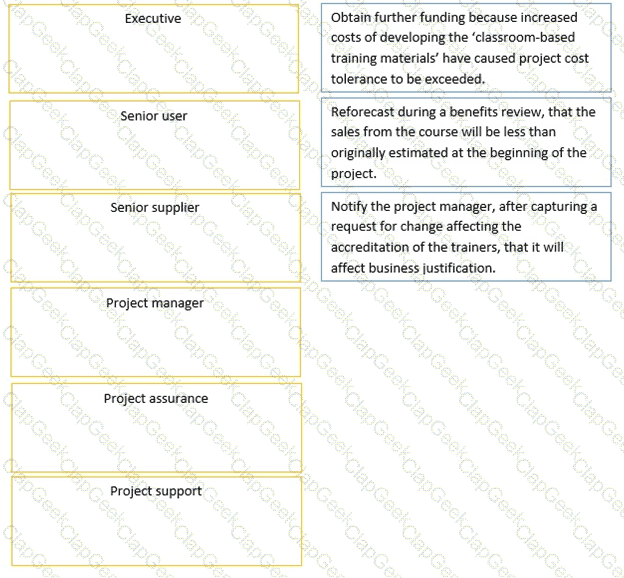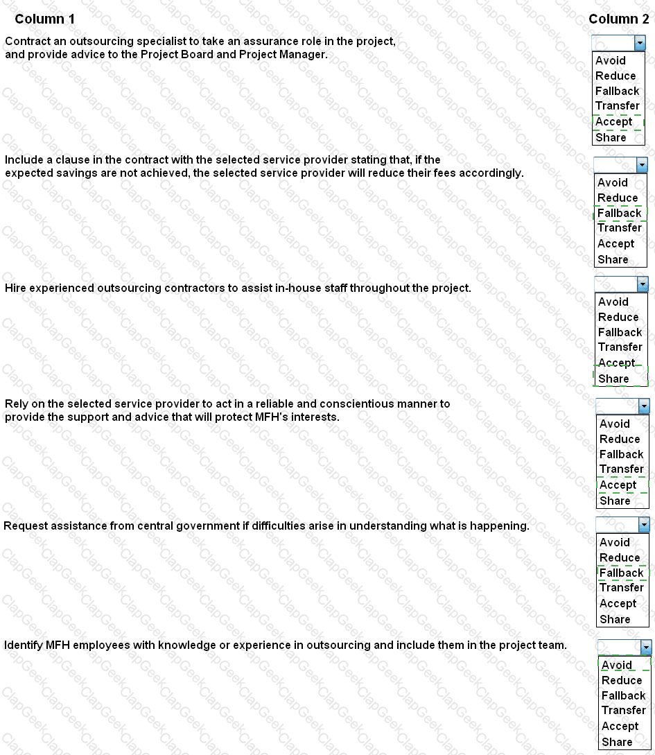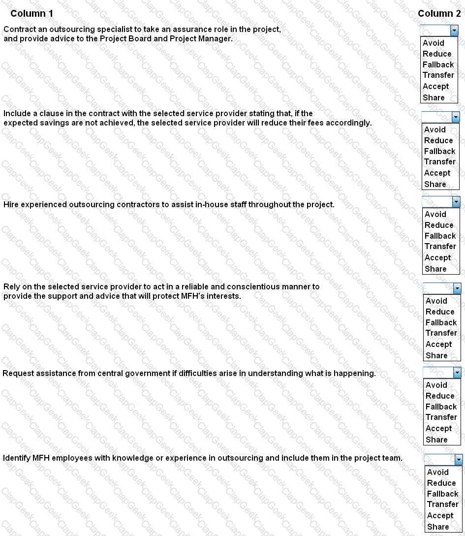 Column 1 contains a number of risk responses identified by the Project Manager following an assessment of this risk. Column 2 contains a list of threat response types. For each risk response in Column 1, select from Column 2 the type of response it represents. Each option from Column 2 can be used once, more than once or not at all.