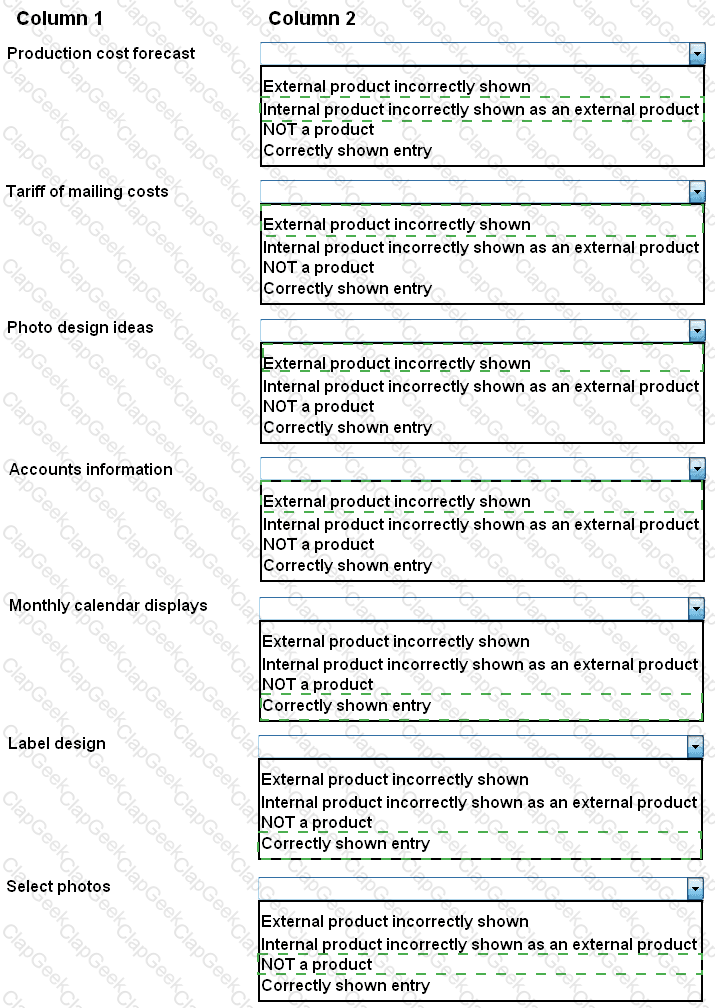 Column 1 is a list of some of the entries in the product breakdown structure. Determine whether each entry in Column 1 has been correctly shown in the product breakdown structure. Select from Column 2 the appropriate statement that correctly describes that entry. Each selection from Column 2 can be used once, more than once or not at all.