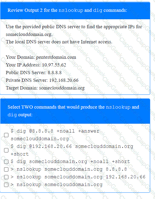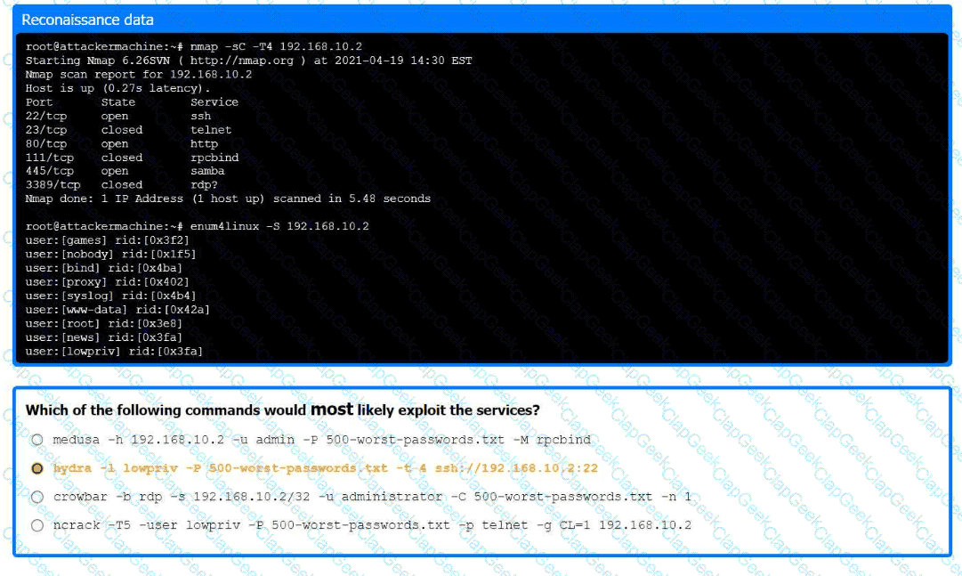 During a penetration test, the tester uses a vulnerability scanner to collect information about any possible vulnerabilities that could be used to compromise the network. The tester receives the results and then executes the following command: