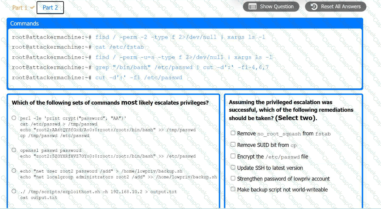 During an assessment, a penetration tester gains a low-privilege shell and then runs the following command: