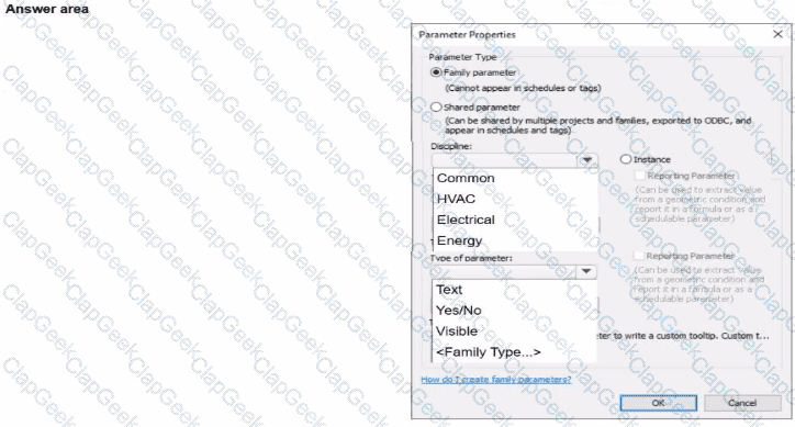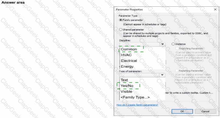 An electrical designer is creating a panelboard family. The electrical designer wants to create a family parameter to control the visibility of a clearance zone. In the Parameter Properties dialog, select the required Discipline and Type for the parameter.